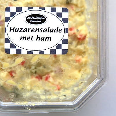 Op een plastic bak zit een sticker met de tekst Ambachtelijke Kwaliteit Huzaransalade met ham.
