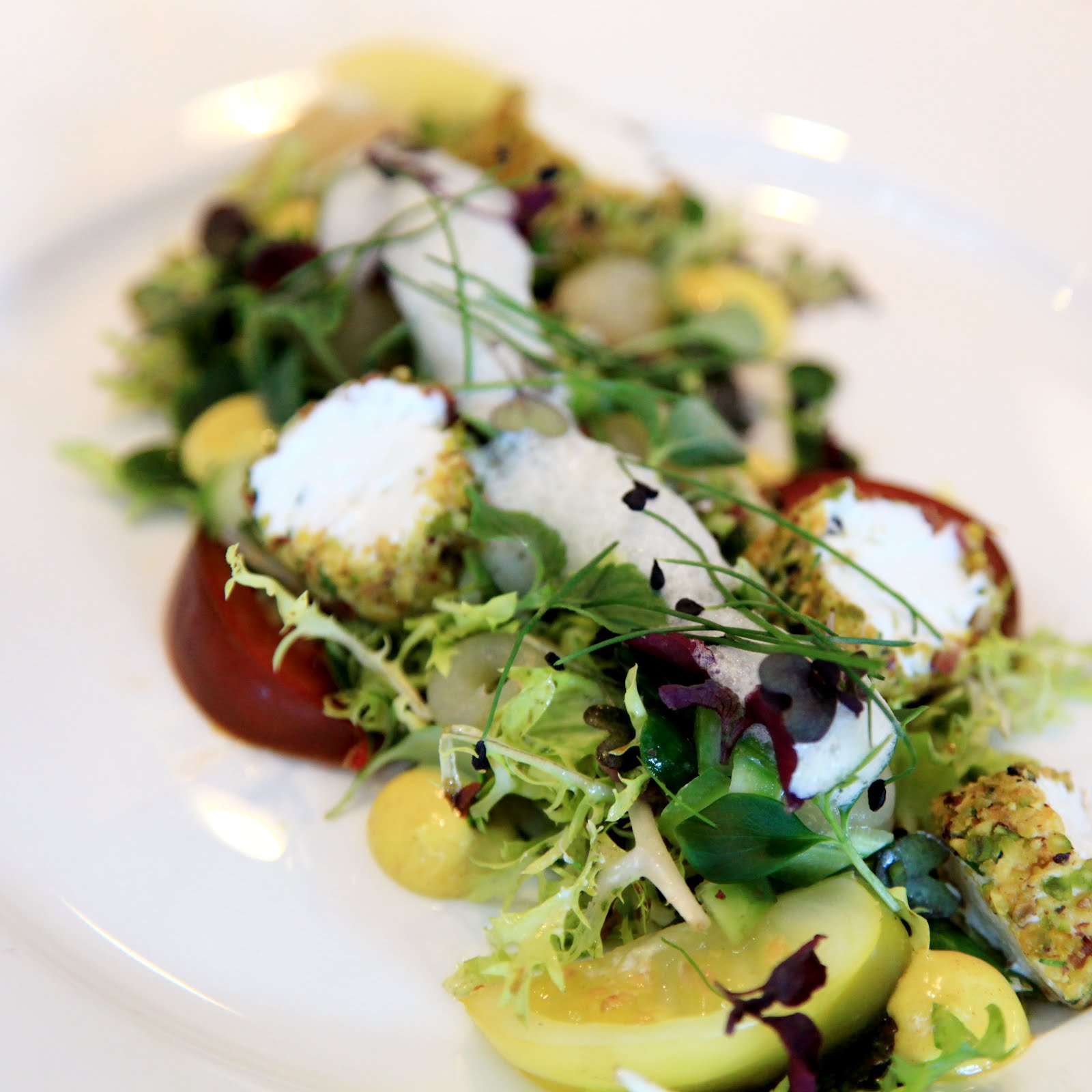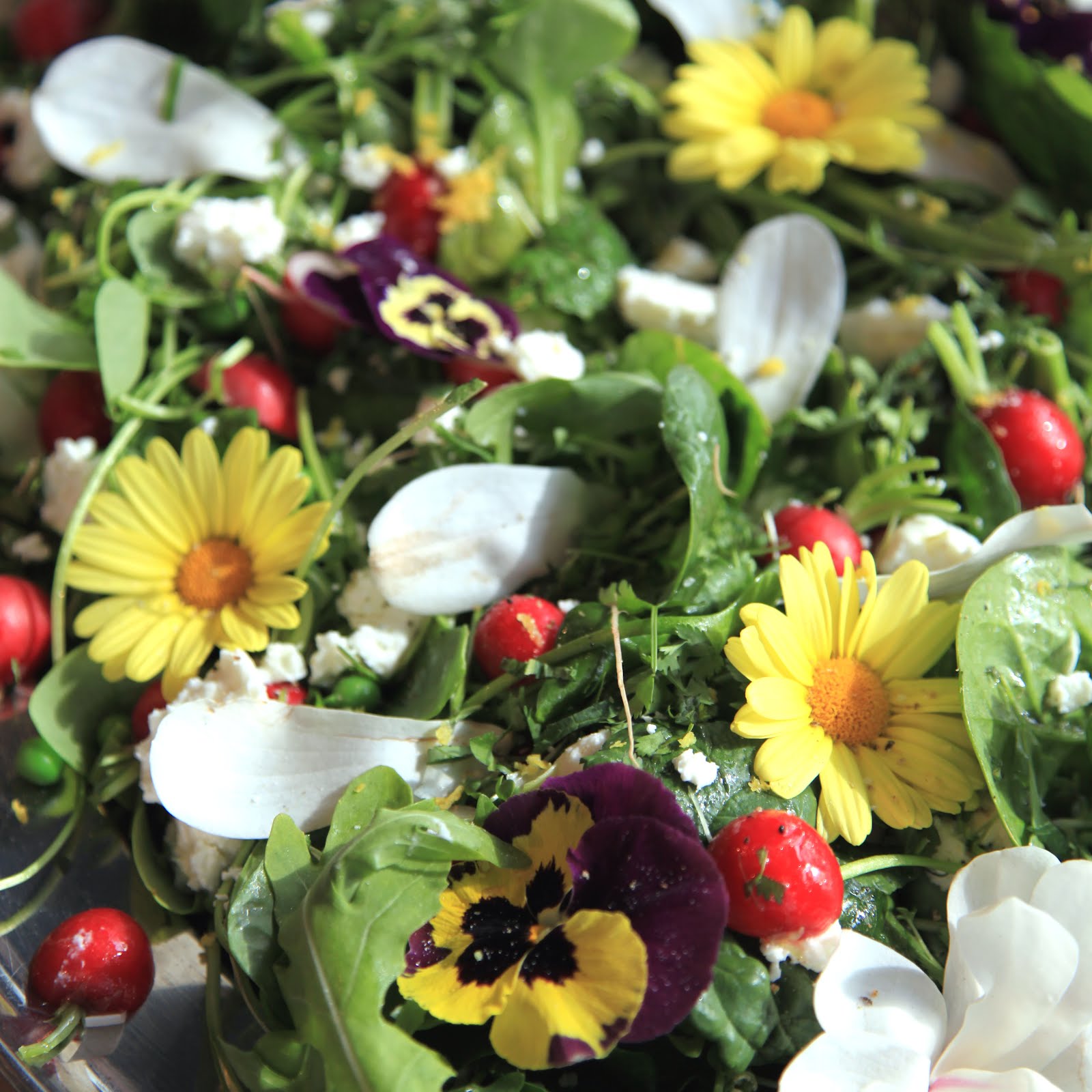 En ik? Ik voelde mij een beetje een kluns tussen al die koks en hun netjes opgemaakte borden want mijn salade was een soort mega bloemenweide in de lente geworden. Er zat van alles door; wilde spinazie, rucola, postelein, tuinboontjes, radijsjes, schapenfeta, munt, koriander, Oost-Indische kers, citroendressing, magnolia, margriet en viooltjes. Maar gepimpt was ie zeker!